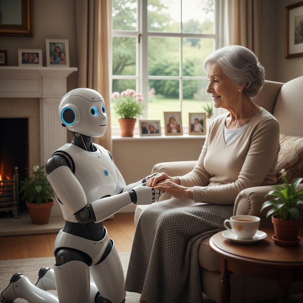 Fotografia starszej kobiety rozmawiającej z robotem – ilustracja praktycznego zastosowania AI w opiece domowej.