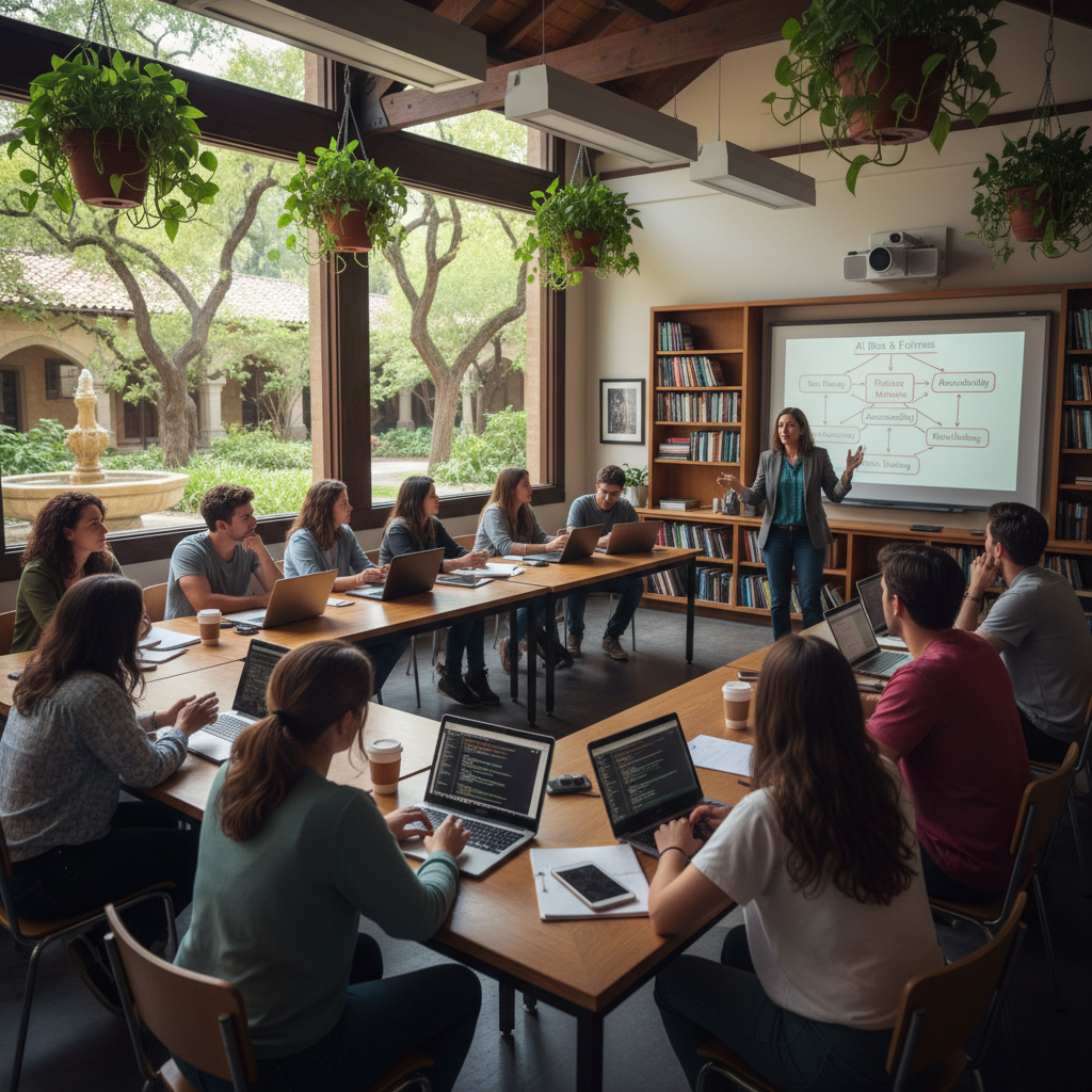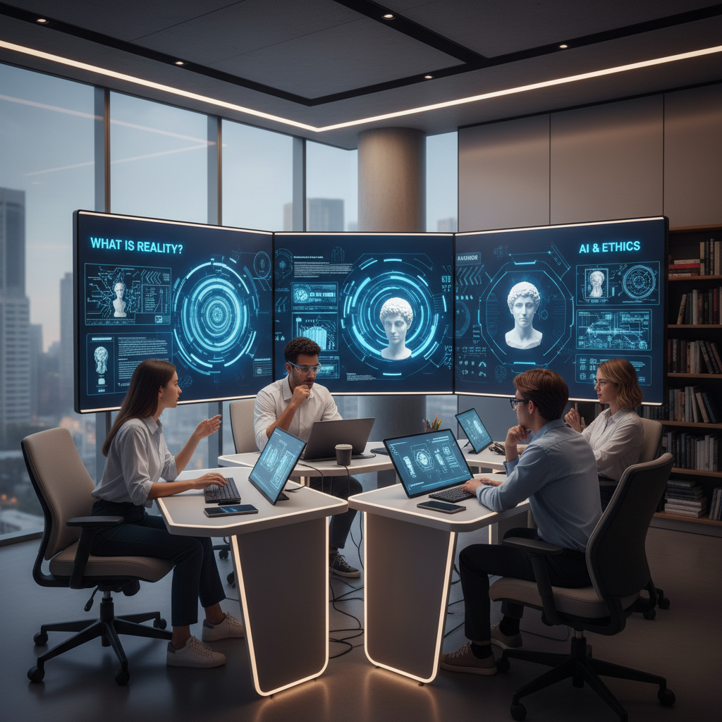Zdjęcie: Nowoczesna sala lekcyjna ukazująca napięcie między technologią a filozofią – doskonała metafora dla edukacji w XXI wieku, z wykorzystaniem słów kluczowych: edukacja technologiczna, filozofia, sztuczna inteligencja.