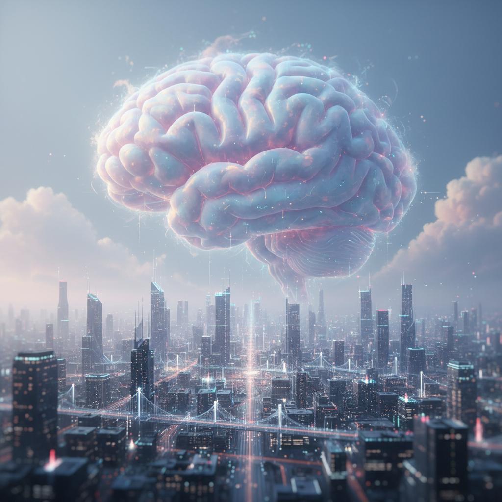 Chmura w kształcie mózgu unosząca się nad cyfrowym miastem – symbol filozofii świadomości w erze AI.