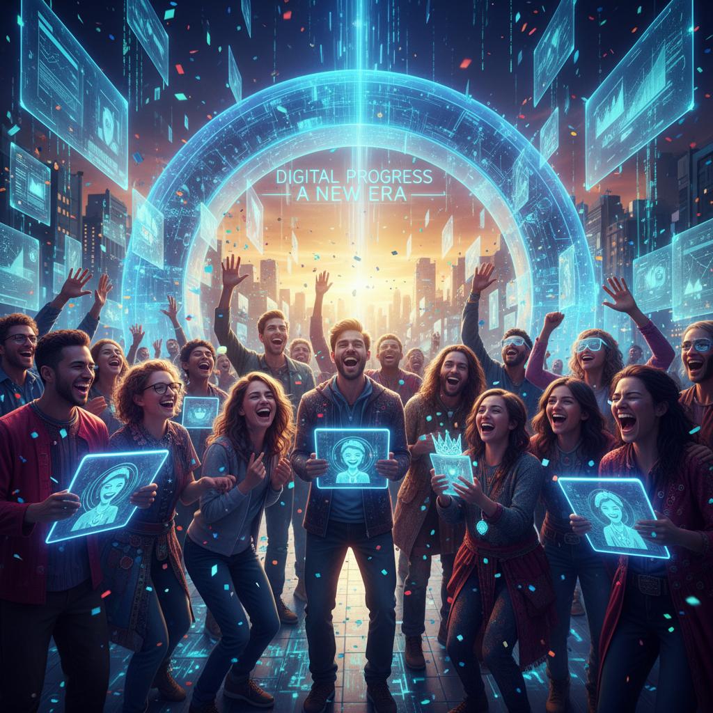 Różnorodna grupa świętuje cyfrowy postęp – symbol optymistycznych scenariuszy, gdzie filozofia ulepsza AI.
